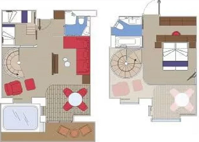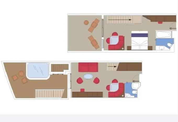 | YJD - Yacht Club Duplex Suite s vírivkou 46 m² + balkón 28-31 m². Vírivka. 2 podlažia, šatník, 2 kúpeľne (1 s vaňou). Max 4 osoby. 16. paluba. Cenový model MSC Yacht Club. | 10 784 € 5 392 € za osobu | ||