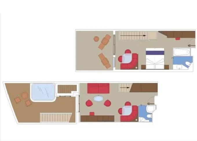 | YJD - Yacht Club Duplex Suite s vírivkou 46 m² + balkón 30 m². Vírivka. 2 podlažia, šatník, 2 kúpeľne (1 s vaňou). Max 4 osoby. 16. paluba. Cenový model MSC Yacht Club. Easy package v cene | 9 502 € 4 751 € za osobu | ||